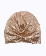 Rose gold sequin silk knot turban hat with hand pleated detailing. This sequin turban is made with 100% silk lining and pleated for an easier fit. The turban sizing works for straight hair and curly voluminous hair. Make a statement with this day to evening glamorous turban hat, especially on not so great hair days! For an extra glamorous, old Hollywood look add your favourite brooch at the front of the gathering.