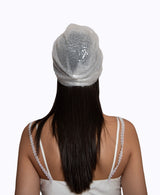 Transparent sequin tulle knot turban hat with hand pleated detailing. This sequin turban is made with a sheer tulle lining for an overall transparent look and pleated for an easier fit. The turban sizing works for straight hair and curly voluminous hair. Make a statement with this day to evening glamorous turban hat, especially on not so great hair days! For an extra glamorous, old Hollywood look add your favourite brooch at the front of the gathering. This turban would also make for a beautiful bridal accessory.