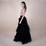 Black Ruffled voluminous tulle maxi skirt. Paired with our Freesia crystal hand beaded bodysuit.