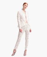 Silk chiffon lace tuxedo suit is made to combine a traditionally masculine look with a modern yet feminine silhouette. The pants are made with a side satin stripe to match the full tuxedo look. The suit can be worn with or without a top underneath. Take this look from day to evening events with a versatile range for styling.